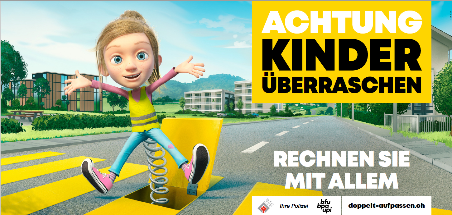 Weiterhin weisen in den Gemeinden Plakate der Kampagne «Achtung, Kinder überraschen - Rechnen Sie mit allem» auf die Gefahren im Strassenverkehr auf und neben dem Schulweg hin. Fahrzeuglenkende werden darauf aufmerksam gemacht, dass sich Kinder auf dem Trottoir oder auf der Strasse oft überraschend verhalten und sich so in Gefahr bringen. Weitere Informationen zur Schulwegkampagne «Achtung, Kinder überraschen – rechnen Sie mit allem» finden Sie unter https://www.doppelt-aufpassen.ch/ .