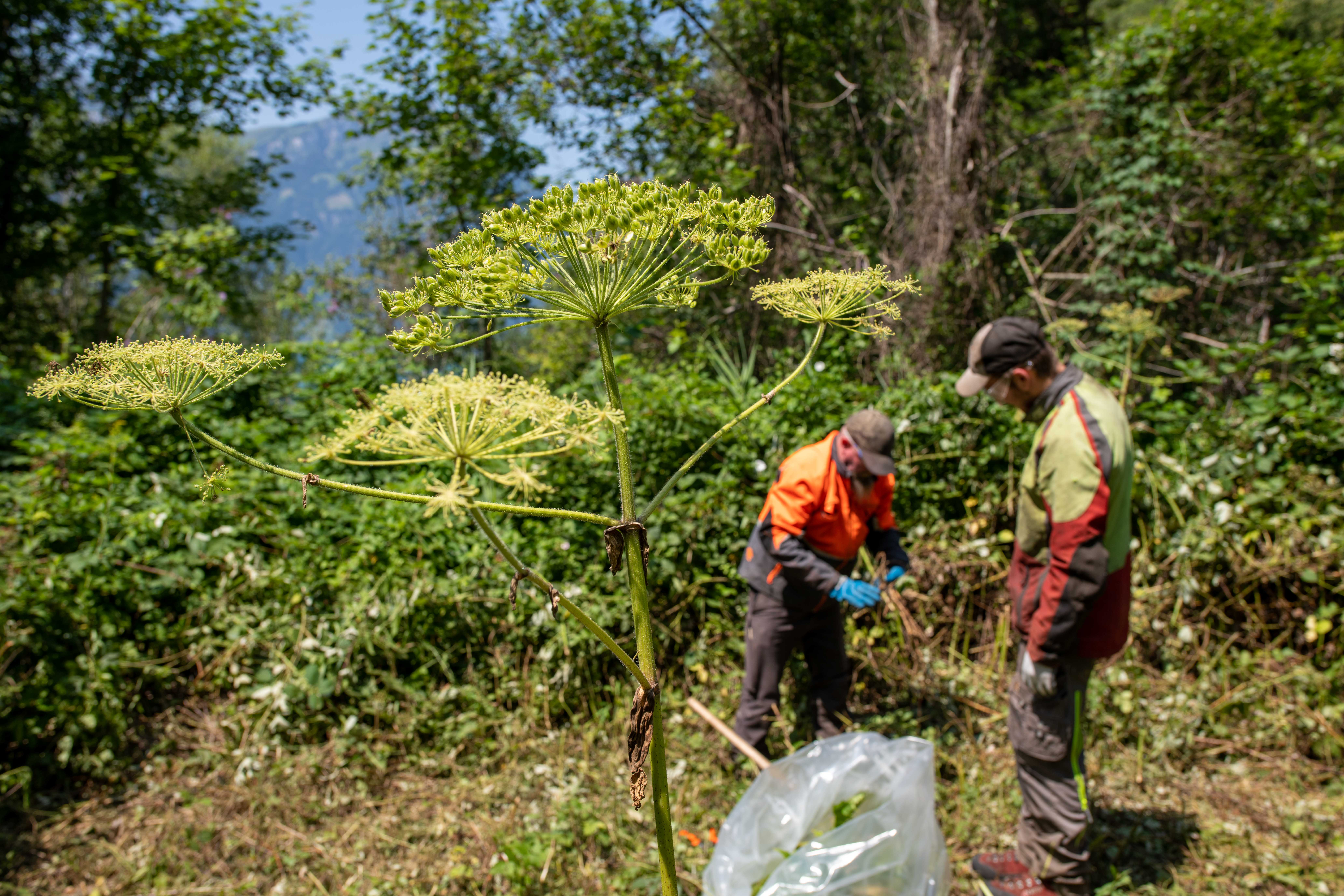 | Bild 1: Der Riesenbärenklau kann bis zu drei Meter hoch werden. Bei der Bekämpfung tragen Heiri Estermann und David Schuler vom Amt für Forst und Jagd, lange Kleider, Schutzbrille und Handschuhe. (JPG, 1.98 MB) | Download | 0 | Bild 1: Der Riesenbärenklau kann bis zu drei Meter hoch werden. Bei der Bekämpfung tragen Heiri Estermann und David Schuler vom Amt für Forst und Jagd, lange Kleider, Schutzbrille und Handschuhe. |