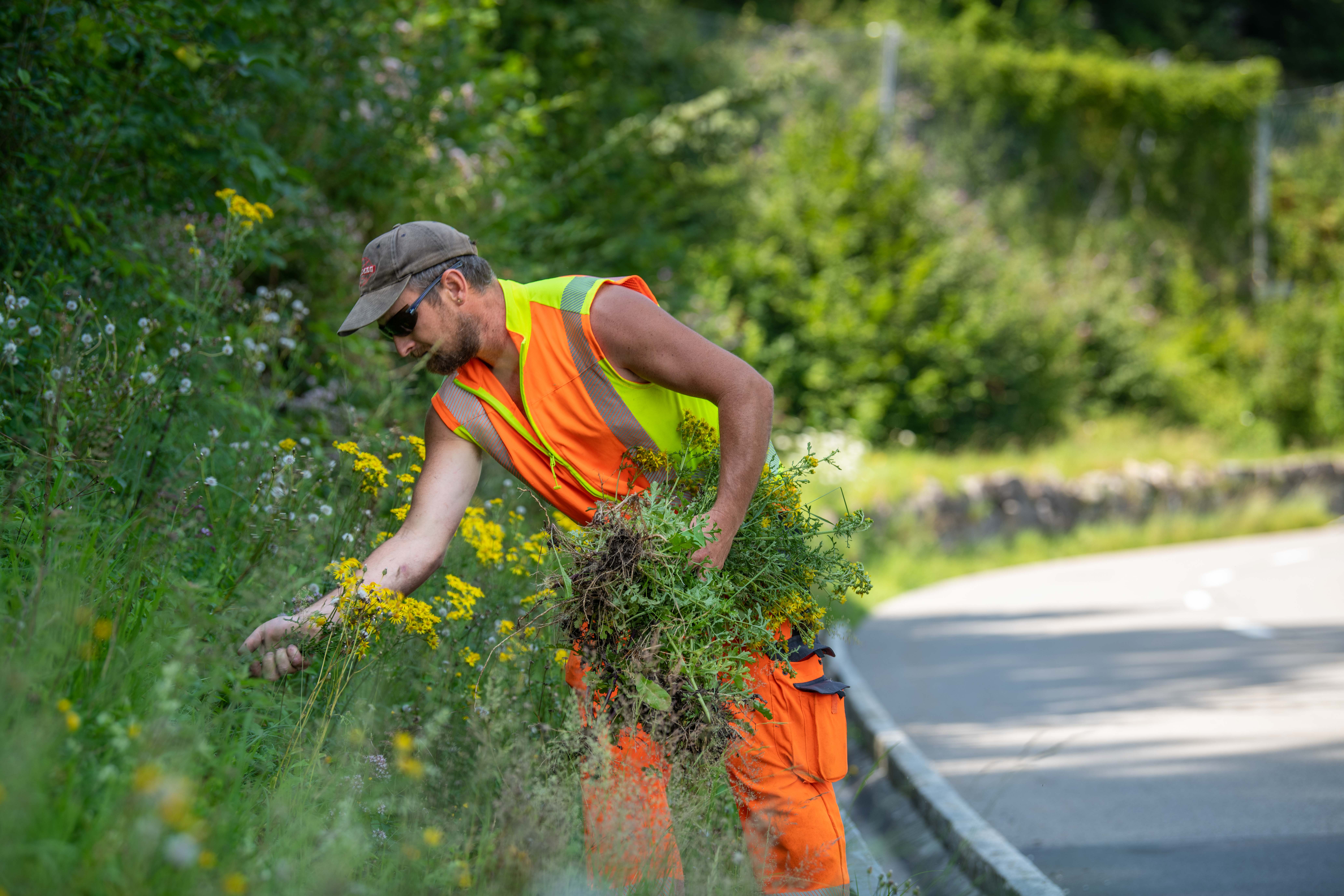 | Bild 2: Entlang der Bauerstrasse reisst Kantonsmitarbeiter Pius Murer das Jakobskreuzkraut aus. Breitet sich das Kraut auf den Weiden aus, gefährdet es die Gesundheit des Viehs. (JPG, 1.88 MB) | Download | 1 | Bild 2: Entlang der Bauerstrasse reisst Kantonsmitarbeiter Pius Murer das Jakobskreuzkraut aus. Breitet sich das Kraut auf den Weiden aus, gefährdet es die Gesundheit des Viehs. |
