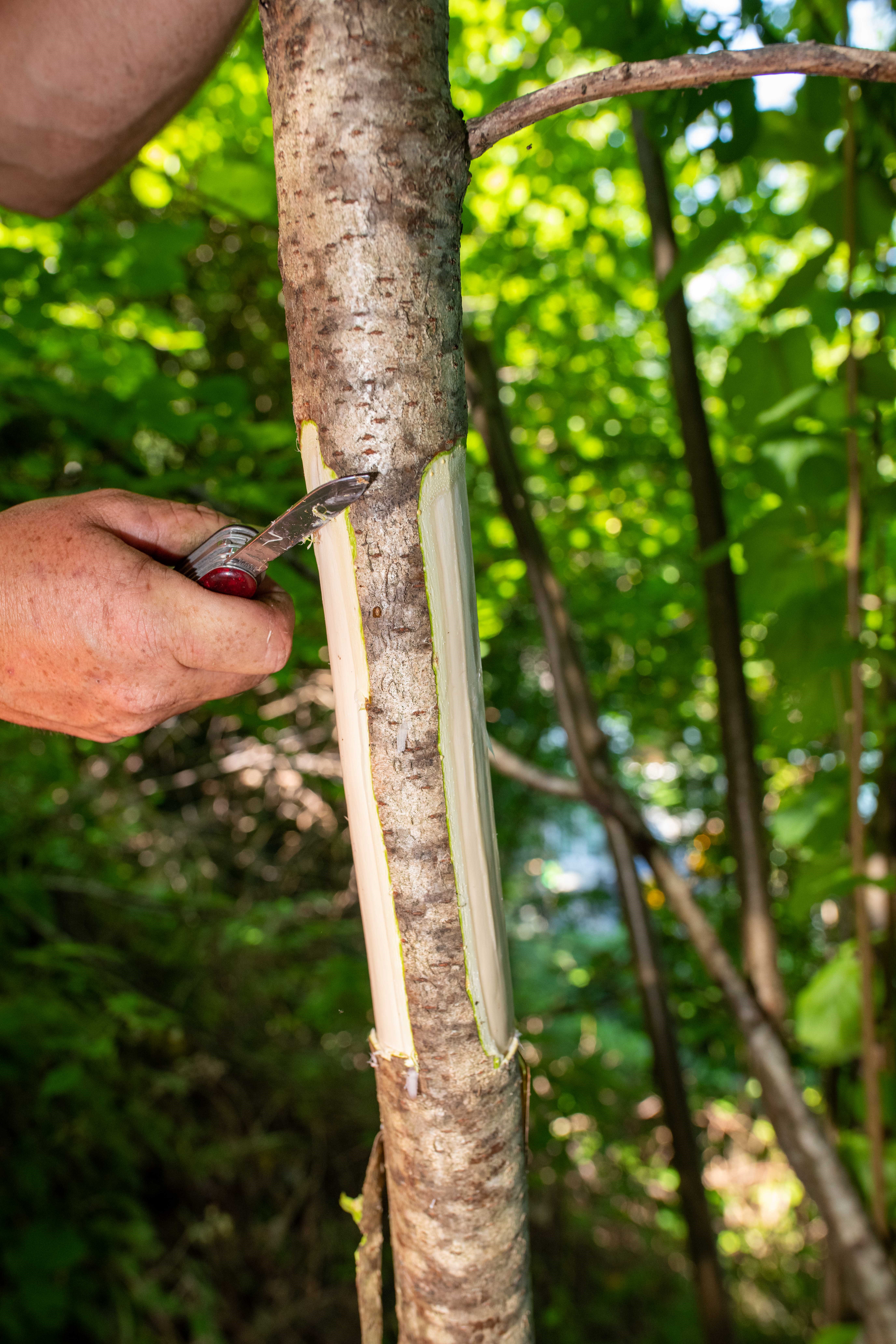 | Bild 3: Die Rinde des Essigbaums wird durch den Forstmitarbeiter abgeschält. (JPG, 4.63 MB) | Download | 2 | Bild 3: Die Rinde des Essigbaums wird durch den Forstmitarbeiter abgeschält. |