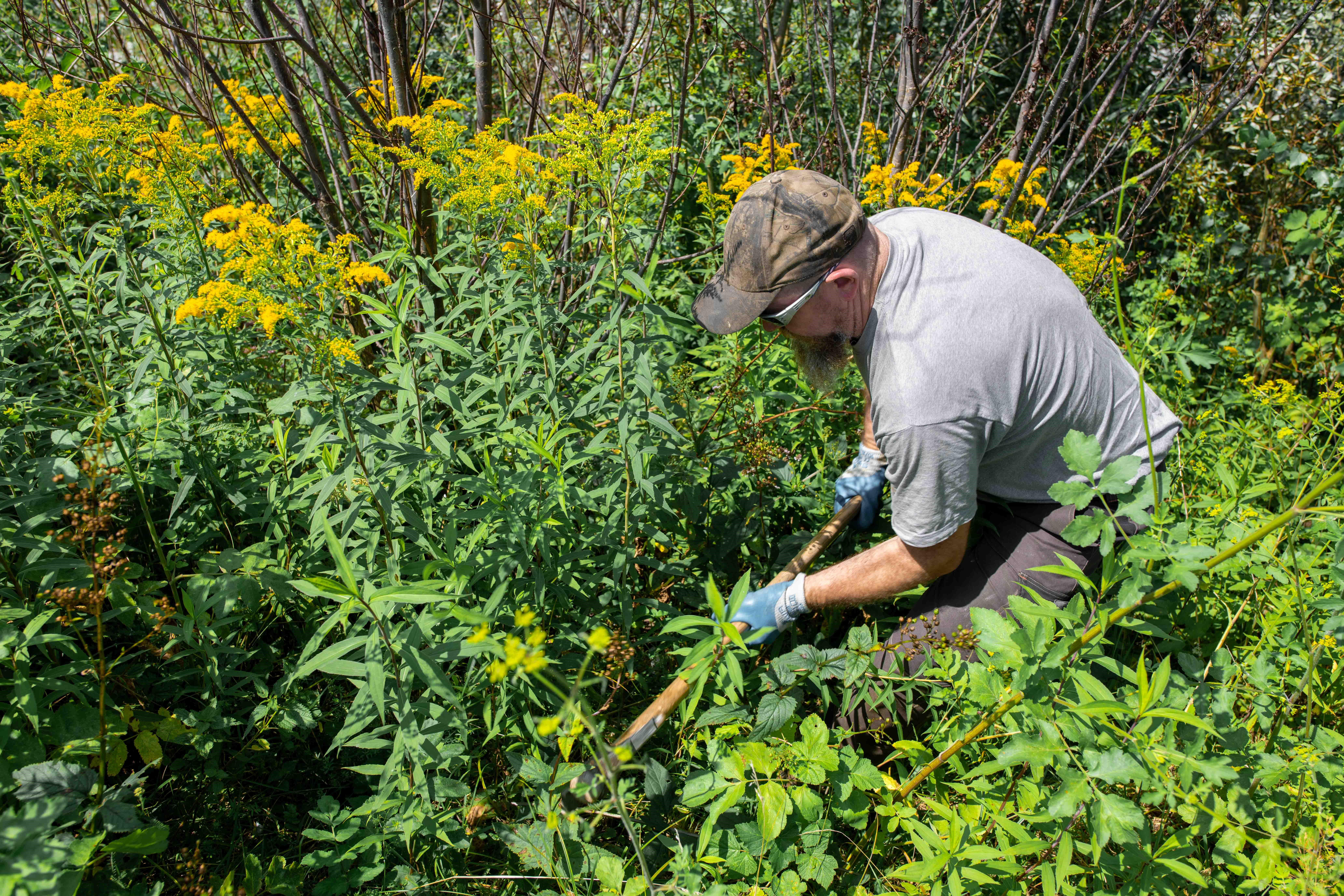 | Bild 5: Die Goldrute wird durch den Forstmitarbeiter mitsamt den Wurzeln ausgegraben. (JPG, 5.37 MB) | Download | 4 | Bild 5: Die Goldrute wird durch den Forstmitarbeiter mitsamt den Wurzeln ausgegraben. |