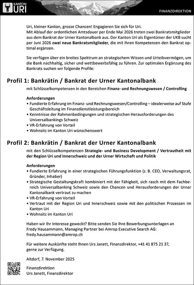 Stelleninserat Bankrat Urner Kantonalbank